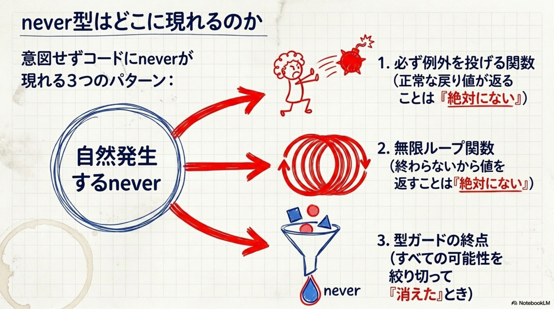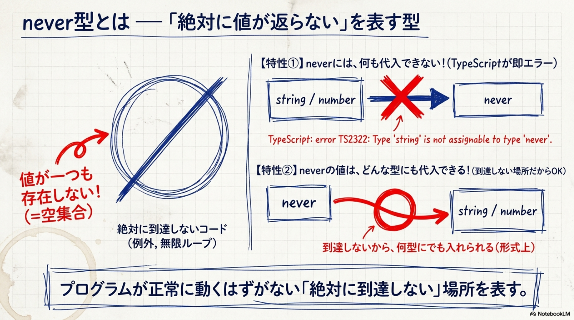 これは、never型が「決して値を持たない」ことを示しているためです。