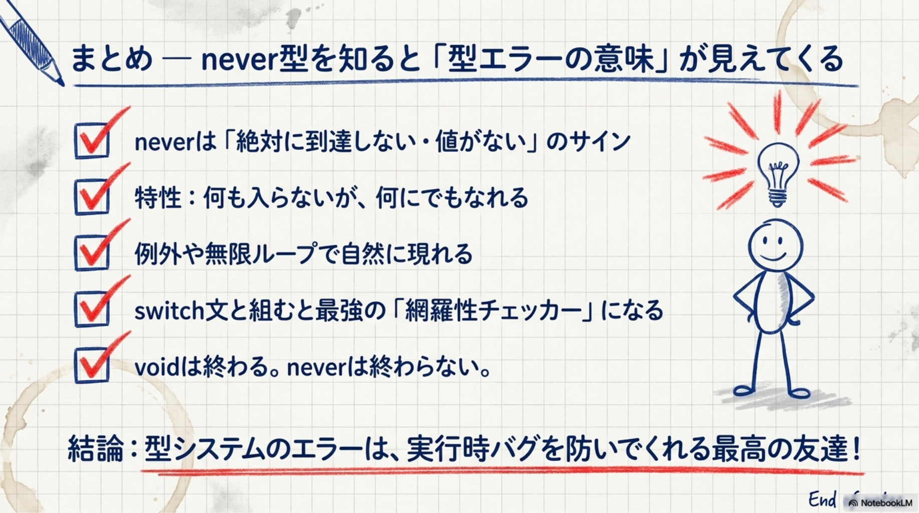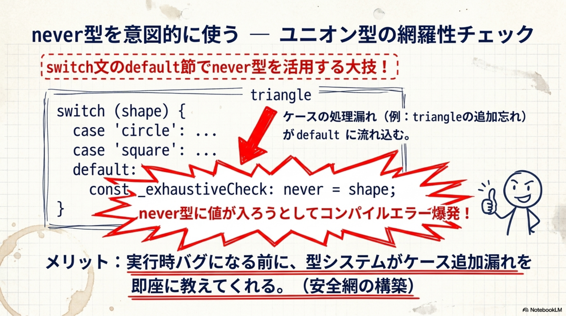 このようにして、never型を使った網羅性チェックを行うことで、コードの安全性とメンテナンス性を向上させることができます。