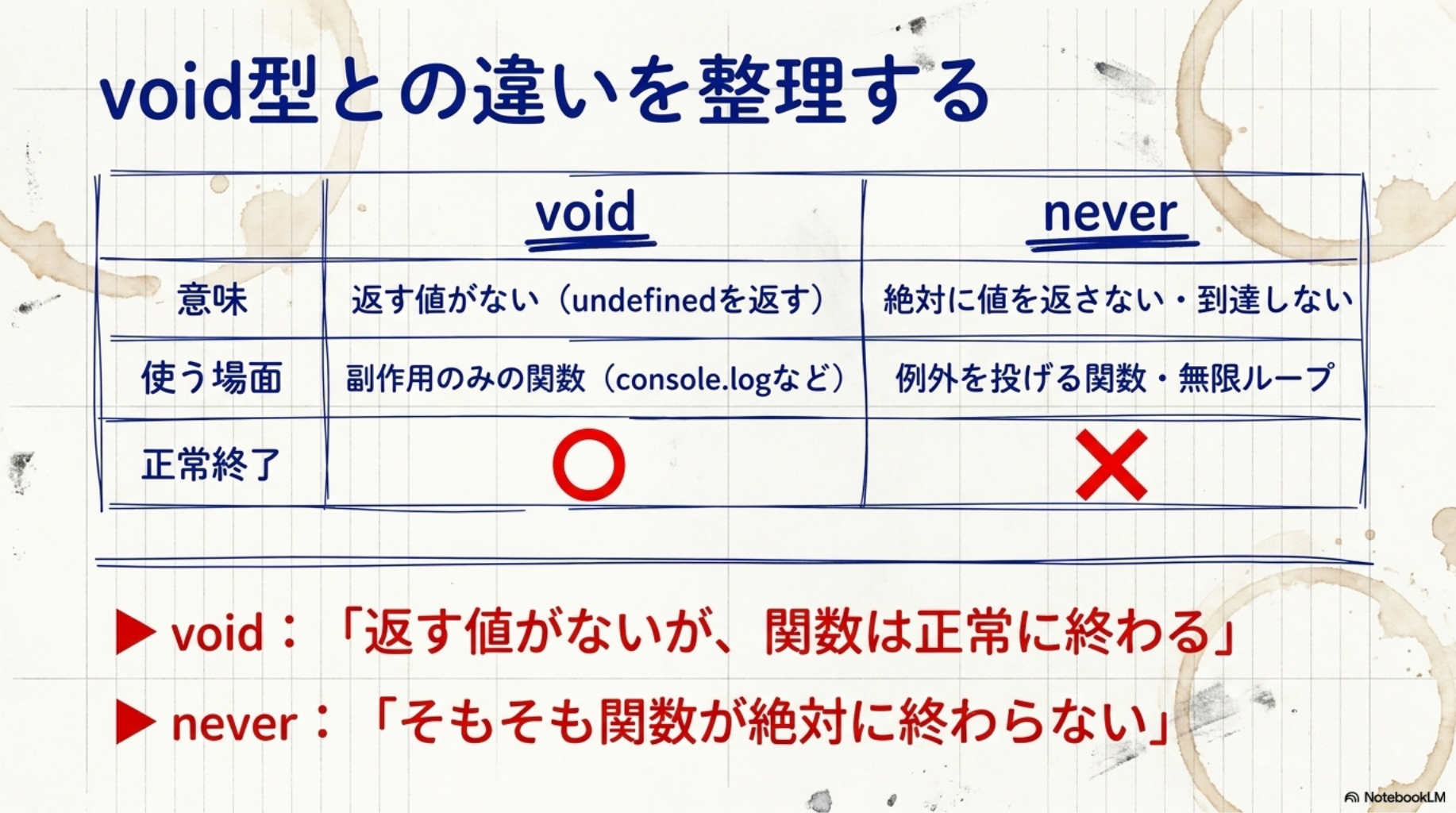 never型は「決して値を返さない」ことを示し、例外をスローする関数や無限ループに使われます。