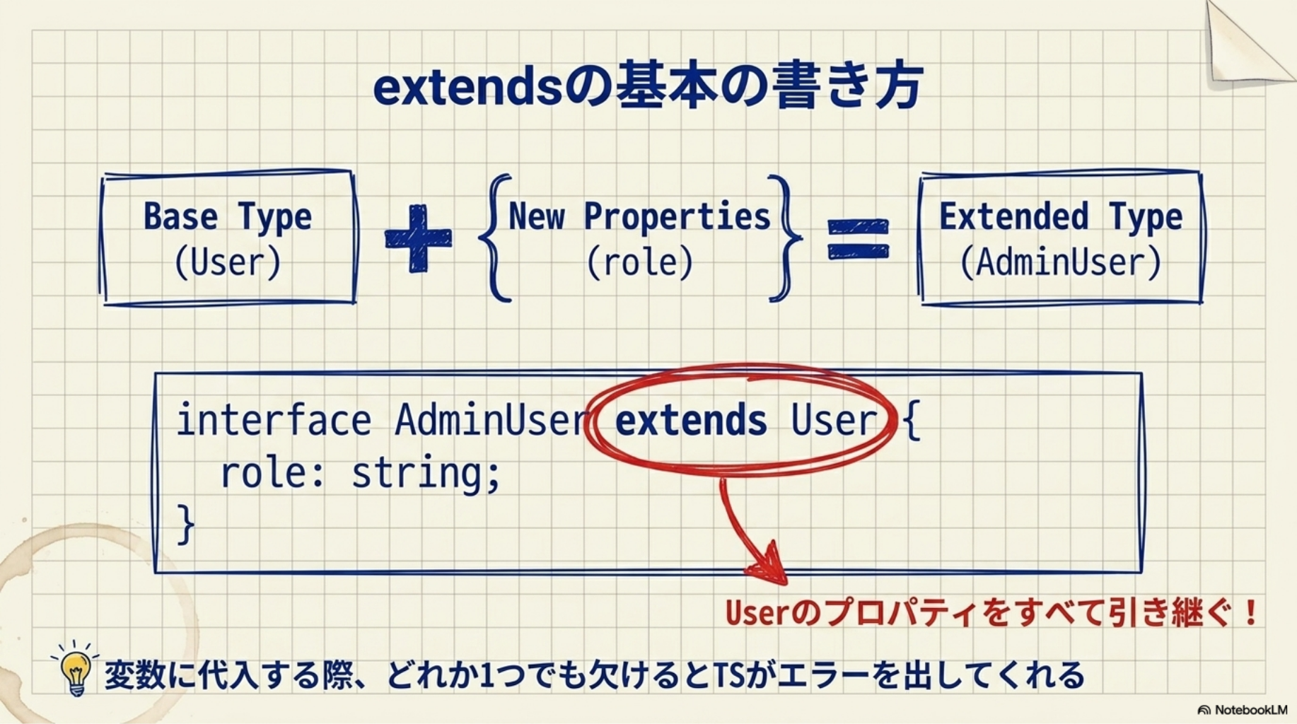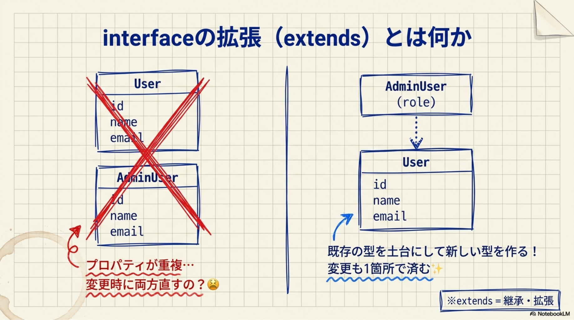 共通部分をひとつのinterfaceにまとめてextendsで使い回す、という設計は実際のコードでよく登場します。「似たような型を何度も書いている」と感じたら、extendsで整理できないか試してみてください。
