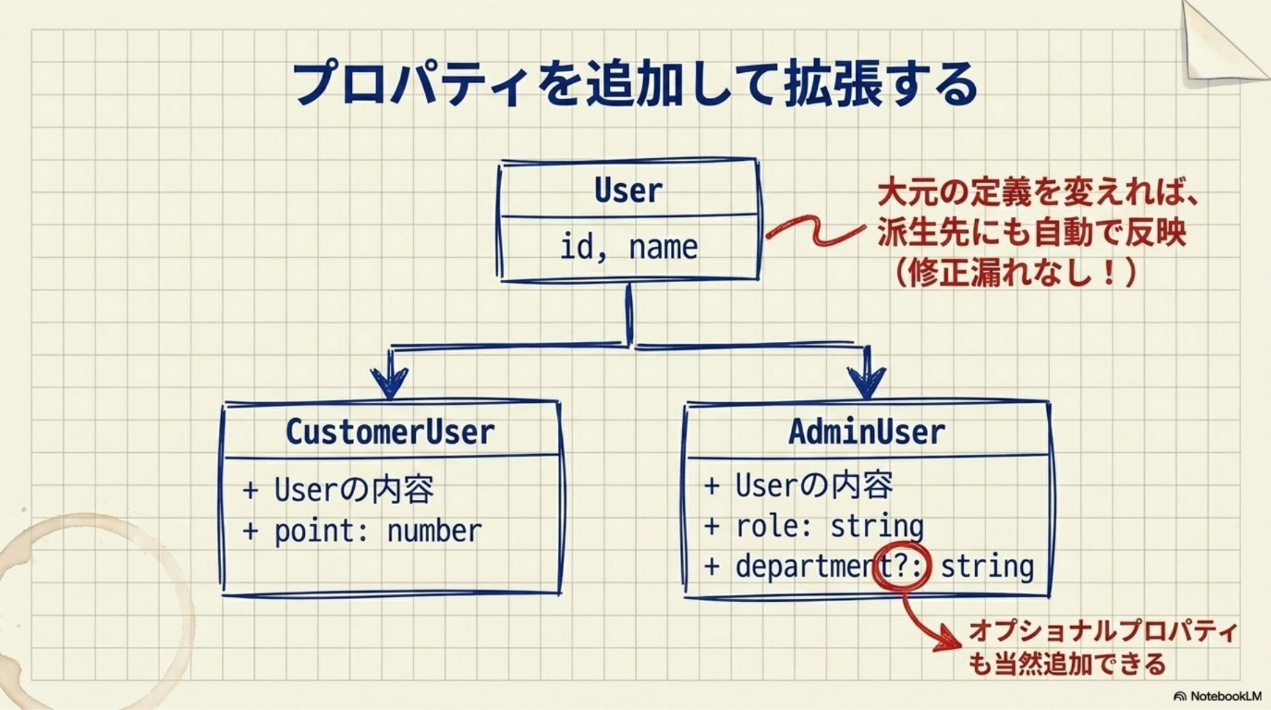 Userを1か所で管理しつつ、それぞれの型に必要なプロパティを追加できます。Userの定義を変えても、CustomerUserやAdminUserに自動で反映されるので、修正漏れのリスクが減ります。