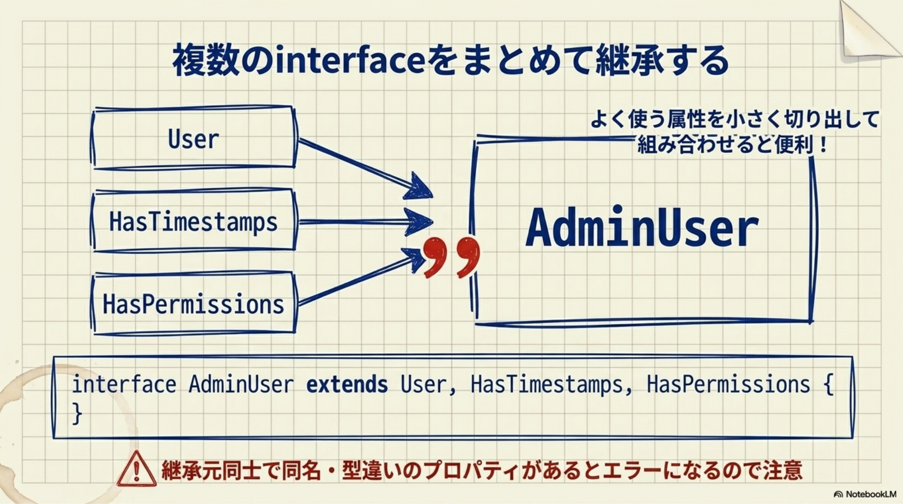 ひとつ注意点として、複数のinterfaceを継承するとき、それぞれのinterfaceに同じ名前のプロパティがあって型が違う場合はエラーになります。継承元同士でプロパティ名が重複しないよう設計しましょう。