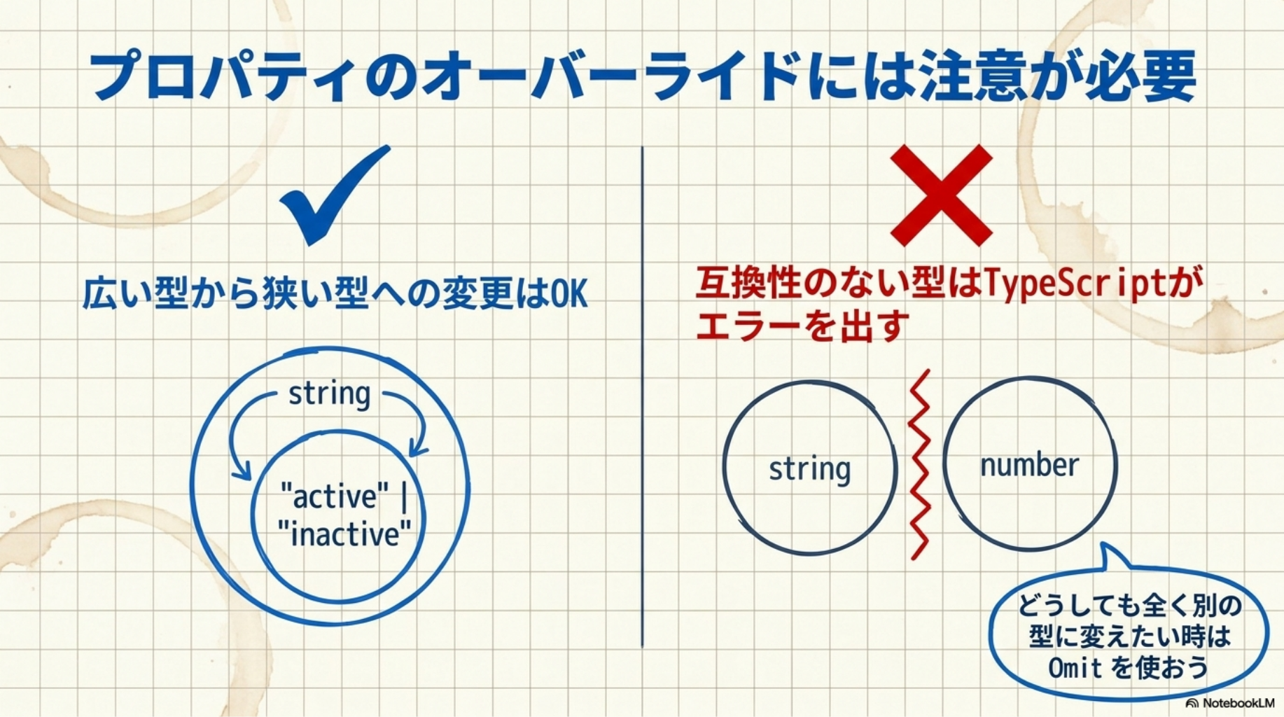 継承元にあるプロパティを拡張先で上書き(オーバーライド)したい場面があるかもしれません。TypeScriptではできる変更とできない変更があります。 この区別を理解しておくと、エラーを出さずに済みます。